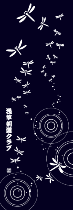 デザイン例は安坊の既成品手ぬぐい「水辺のトンボ」に「浅草剣道クラブ」と名入れしました。 トンボは後退することなく前に進むため「勝虫」と呼ばれ、剣道をされる方に喜ばれる柄です。 |